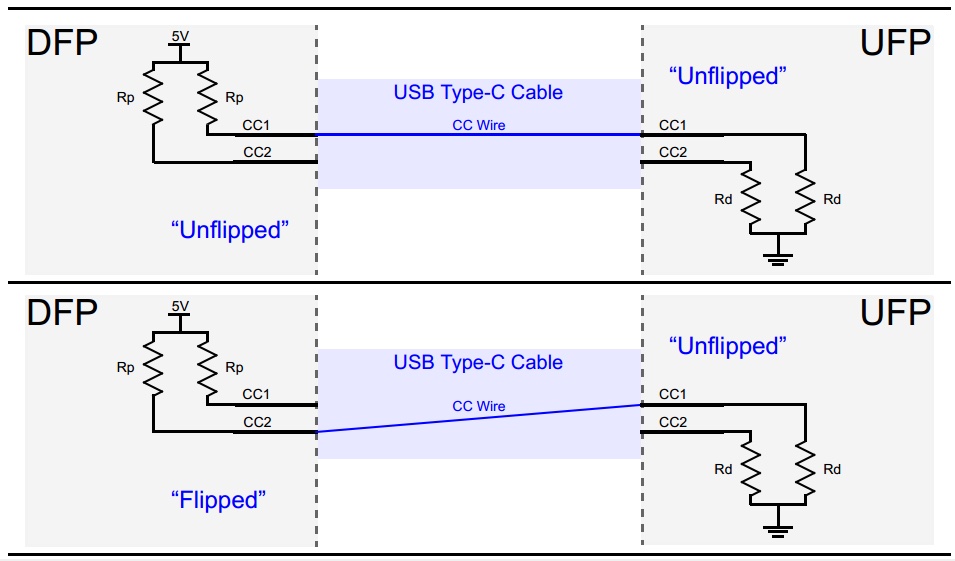 If CC1 connects to CC1 on the other device, the cable is straight. If it's on CC2, it's flipped. So to keep cables thinner, you only need to connect 5 wires on a Type C cable to get power delivery to work. You need GND, VCC (5-20V), D+, D- and one more cable - CC1. More expensive cables will add more wires as I wrote about in this post.