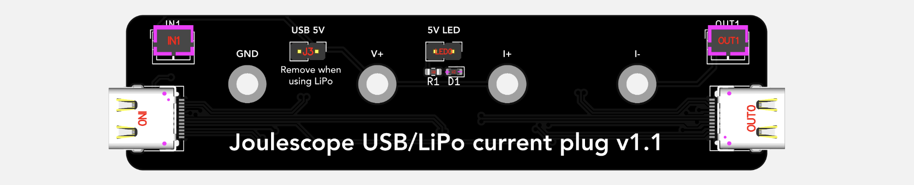 The idea for this board was simple: without any setup in the form of wiring, you just plug a Type C cable on one end and another to the device you want to test. Now you can measure joules extremely precisely. I also added an option to power it from a LiPo battery instead. All the lines from one plug are extended to the other, but power is measured through the Joulescope. It's literally just a passthrough for Type C to Type C.